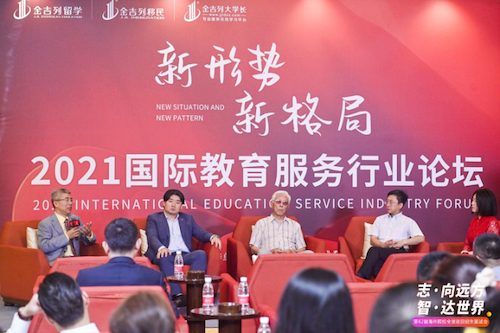 2021國際教育服務(wù)行業(yè)論壇現(xiàn)場,論壇嘉賓:中國教育國際交流協(xié)會出國留學(xué)服務(wù)分會秘書長印凱(右二)、愛爾蘭教育推廣署負(fù)責(zé)人楊杰(左二)、中國駐外前教育參贊、金吉列出國留學(xué)消費教育學(xué)校指導(dǎo)專家李振平(左三)、金吉列留學(xué)董事長朱燕民(左一)、主持人光明日報《留學(xué)》雜志副總經(jīng)理趙冰燃(右一)