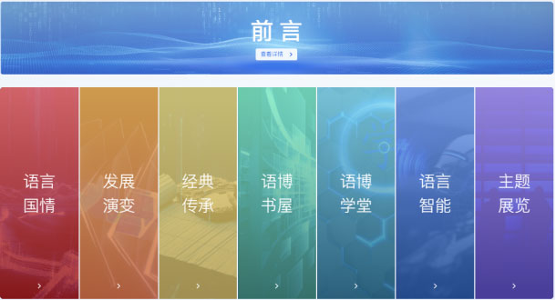 根據(jù)語(yǔ)言文字特點(diǎn)及其文化特征,語(yǔ)博一期建設(shè)分為語(yǔ)言國(guó)情、發(fā)展演變、經(jīng)典傳承、語(yǔ)博書屋、語(yǔ)博學(xué)堂、語(yǔ)言智能、主題展覽7個(gè)主體版塊,以及數(shù)據(jù)庫(kù)、視聽館、互動(dòng)體驗(yàn)館3個(gè)資源模塊,橫縱交叉、立體展示。