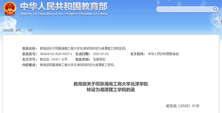 6月30日,教育部發(fā)布《教育部關(guān)于同意湖南工商大學(xué)北津?qū)W院轉(zhuǎn)設(shè)為湘潭理工學(xué)院的函》。文件指出,經(jīng)教育部黨組會(huì)議研究決定,同意湖南工商大學(xué)北津?qū)W院轉(zhuǎn)設(shè)為湘潭理工學(xué)院,同時(shí)撤銷(xiāo)湖南工商大學(xué)北津?qū)W院的建制。