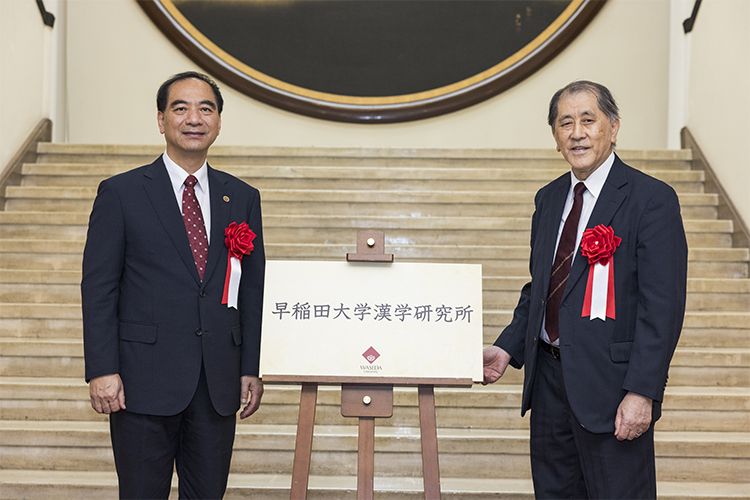 下午,代表團(tuán)一行出席早稻田大學(xué)漢學(xué)研究所揭幕儀式,龔旗煌與田中愛治共同為研究所成立揭幕,雙方代表各自學(xué)校簽署了《北京大學(xué)-早稻田大學(xué)關(guān)于漢學(xué)研究所的合作意向書》。日本亞洲共同體文化合作機(jī)構(gòu)會(huì)長、日本原首相福田康夫,中國駐日本大使館吳江浩分別就漢學(xué)研究所成立發(fā)來賀信。日中友好會(huì)館會(huì)長、日本原駐華大使宮本雄二,中國駐日本大使館教育參贊郭軍,康師傅控股有限公司董事長魏宏名出席儀式。隨后,代表團(tuán)參觀了“早稻田大學(xué)與北京大學(xué)1882—1921特別展”。