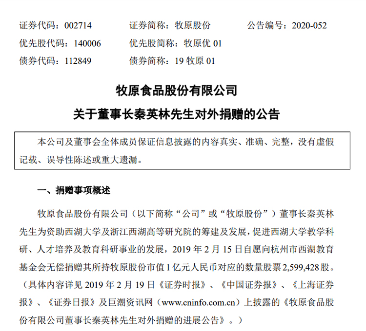 公開資料顯示,牧原股份及其董事長秦英林此前多次向西湖教育基金會捐贈。