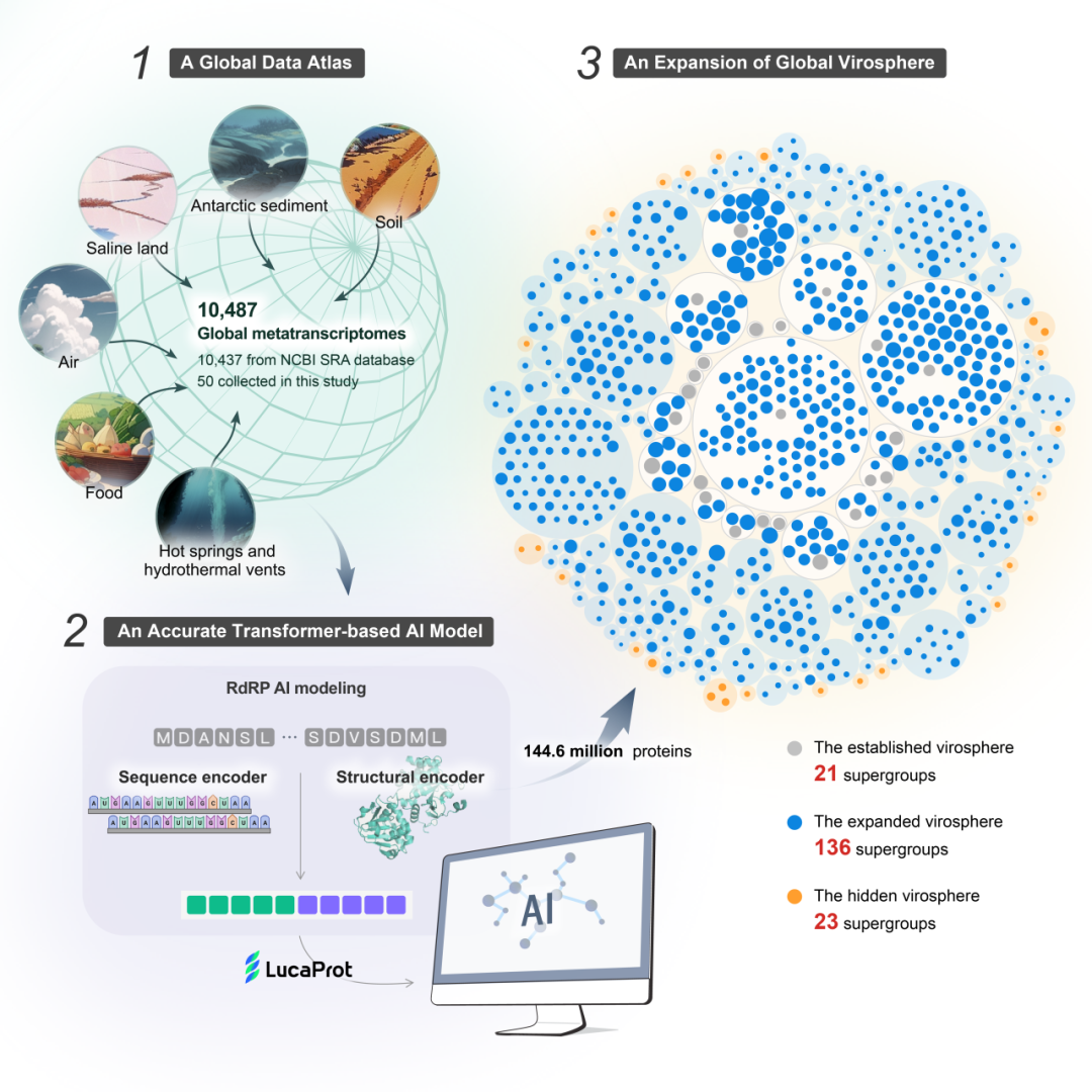 10月9日,中山大學醫(yī)學院施莽教授團隊與阿里云李兆融團隊在《細胞》(Cell)雜志上發(fā)表論文,報告了180個超群、超過16萬種全球RNA病毒的發(fā)現(xiàn)。這是迄今為止規(guī)模最大的RNA病毒研究,大幅擴展了全球RNA病毒的多樣性。該研究將人工智能技術應用于病毒鑒定,發(fā)現(xiàn)了傳統(tǒng)方法未能發(fā)現(xiàn)的病毒“暗物質”,探索了病毒學研究的新路徑。
