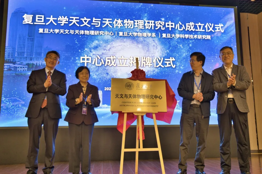 國家自然科學基金委數理科學部副主任倪培根、南京天文光學技術研究所崔向群院士、復旦大學副校長周磊教授、復旦大學天文與天體物理研究中心主任袁峰教授共同為研究中心揭牌。復旦大學科學技術研究院院長彭慧勝院士主持開幕式。