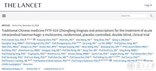 在這項(xiàng)題為“Traditional Chinese medicine FYTF-919 (Zhongfeng Xingnao oral prescription) for the treatment of acute intracerebral haemorrhage: a multicentre, randomised, placebo-controlled, double-blind, clinical trial”(《中醫(yī)藥FYTF919治療急性腦出血:一項(xiàng)多中心隨機(jī)、安慰劑對(duì)照的雙盲臨床研究》)的研究中,研究人員發(fā)現(xiàn),“中風(fēng)醒腦方”在整體上未對(duì)急性腦出血患者的臨床預(yù)后產(chǎn)生顯著改善,但在特定群體——皮層出血和中等以上出血患者中,顯示出潛在效果(有待進(jìn)一步驗(yàn)證)。