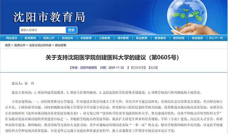近日,沈陽(yáng)市教育局網(wǎng)站發(fā)布《關(guān)于支持沈陽(yáng)醫(yī)學(xué)院創(chuàng)建醫(yī)科大學(xué)的建議(第0605號(hào))》,其中提到,市教育局正在加快研制《沈陽(yáng)市屬高校高質(zhì)量發(fā)展實(shí)施方案》,該方案已將“沈陽(yáng)醫(yī)學(xué)院更名為沈陽(yáng)醫(yī)科大學(xué)、努力建成有特色、高水平的地方應(yīng)用型醫(yī)科大學(xué)”作為沈陽(yáng)市發(fā)展市屬高校的重要建設(shè)目標(biāo)之一。為配合沈陽(yáng)醫(yī)學(xué)院升格醫(yī)科大學(xué)建設(shè),市財(cái)政部門(mén)在2024年部門(mén)預(yù)算安排基礎(chǔ)上,籌措資金1000萬(wàn)元支持醫(yī)學(xué)院購(gòu)置教學(xué)科研設(shè)備,助力學(xué)校高水平醫(yī)科大學(xué)建設(shè)。