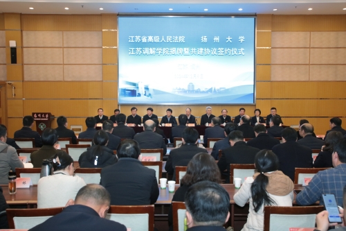 12月9日下午,揚(yáng)州大學(xué)舉行江蘇調(diào)解學(xué)院揭牌暨共建協(xié)議簽約儀式。活動(dòng)現(xiàn)場(chǎng),江蘇省高級(jí)人民法院黨組書(shū)記、院長(zhǎng)夏道虎,揚(yáng)州大學(xué)黨委書(shū)記焦新安共同為“江蘇調(diào)解學(xué)院”揭牌。江蘇省高院與揚(yáng)州大學(xué)共同簽訂《共建江蘇調(diào)解學(xué)院合作框架協(xié)議》,揚(yáng)州中院與揚(yáng)州大學(xué)共同簽訂《全面合作協(xié)議》。