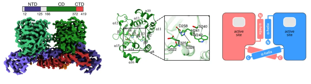 研究團隊成功表達并純化了具有活性的猴痘病毒核心蛋白酶,結(jié)合單顆粒冷凍電鏡和X射線晶體衍射技術,解析了其高分辨率的三維結(jié)構(gòu)(圖1)。核心蛋白酶呈現(xiàn)出二體的組裝模式,每個單體包括N端結(jié)構(gòu)域(N-terminal domain, NTD),催化結(jié)構(gòu)域(catalytic domain, CD)和C端結(jié)構(gòu)域(C-terminal domain, CTD)?;钚灾行奈挥诖呋Y(jié)構(gòu)域,包含一個催化三聯(lián)體Cys328-His241-Asp258。猴痘病毒核心蛋白酶的二體相互作用模式與其他重要人類病毒的蛋白酶不同,是核心蛋白酶結(jié)構(gòu)穩(wěn)定和發(fā)揮催化功能的關鍵。