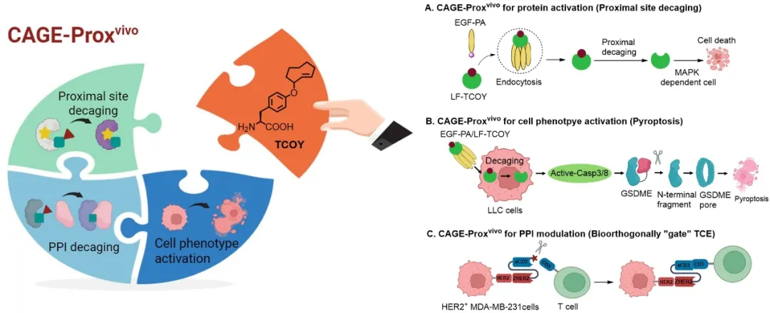 該工作通過機(jī)器學(xué)習(xí)與生物正交剪切反應(yīng)融合驅(qū)動(dòng),獲得了一種創(chuàng)新的蛋白質(zhì)原位激活平臺(tái)技術(shù)CAGE-Proxvivo,能夠在活體動(dòng)物中瞬時(shí)激活目標(biāo)蛋白質(zhì)的功能,并精確調(diào)節(jié)蛋白-蛋白相互作用。此外,CAGE-Proxvivo還可以調(diào)節(jié)細(xì)胞表型,誘導(dǎo)腫瘤細(xì)胞發(fā)生焦亡,增強(qiáng)抗腫瘤免疫響應(yīng)。
