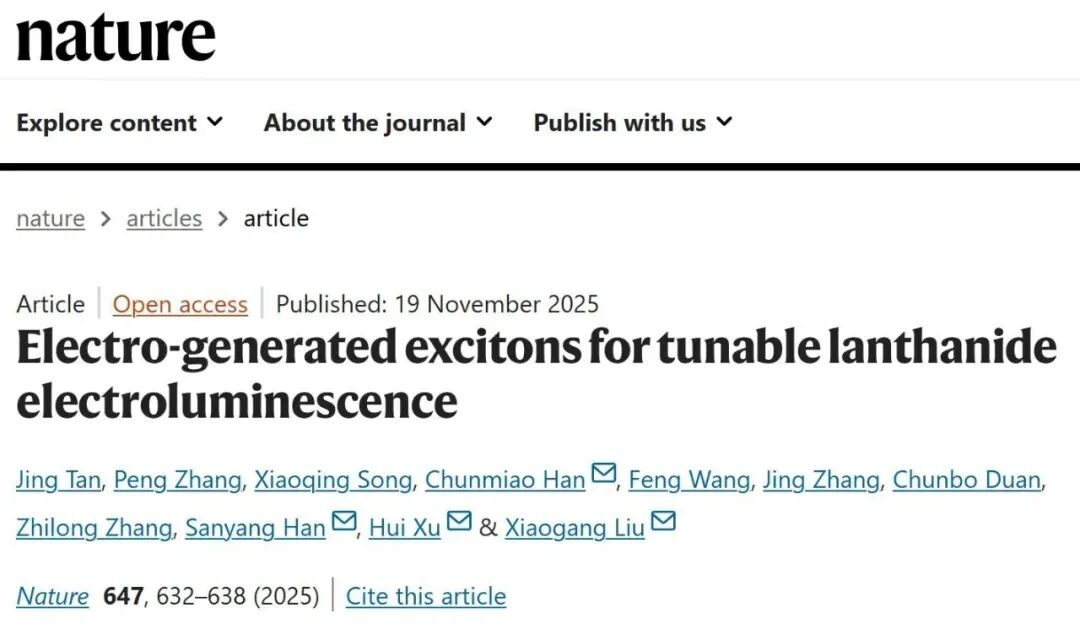 11月20日,黑龍江大學(xué)許輝教授團(tuán)隊(duì)與合作者打磨了十四年的研究成果以“捕獲電生激子實(shí)現(xiàn)可調(diào)諧的鑭系納米晶電致發(fā)光”為題,在線發(fā)表于國際頂級(jí)期刊Nature,這是黑龍江大學(xué)首篇Nature論文,也是黑龍江省化學(xué)學(xué)科首篇Nature論文。