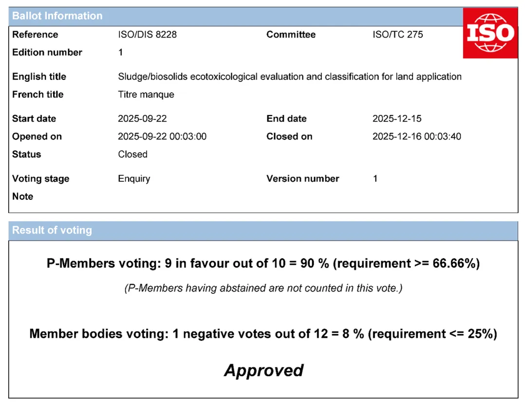近日,國際標(biāo)準(zhǔn)化組織(ISO)正式公布ISO/DIS 8228《污泥土地利用風(fēng)險評估及分級標(biāo)準(zhǔn)》(Sludge/biosolids ecotoxicological evaluation and classification for land application)制定的最終投票結(jié)果。根據(jù)ISO技術(shù)委員會的統(tǒng)計數(shù)據(jù),該標(biāo)準(zhǔn)送審案在參與投票的成員國中獲得90%的高票通過,遠(yuǎn)超國際標(biāo)準(zhǔn)化組織規(guī)定的66.66%通過線,充分展示國際上對中國提出的污泥安全資源化系統(tǒng)解決方案與標(biāo)準(zhǔn)的高度肯定。
