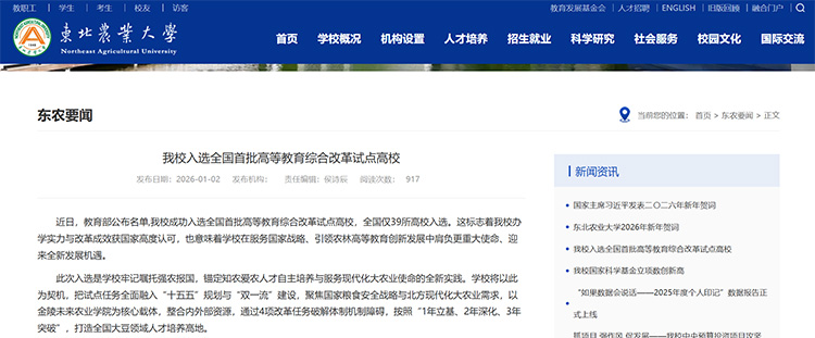 近日,教育部公布名單,東北農業(yè)大學成功入選全國首批高等教育綜合改革試點高校,全國僅39所高校入選。這標志著學校辦學實力與改革成效獲國家高度認可,也意味著學校在服務國家戰(zhàn)略、引領農林高等教育創(chuàng)新發(fā)展中肩負更重大使命、迎來全新發(fā)展機遇。