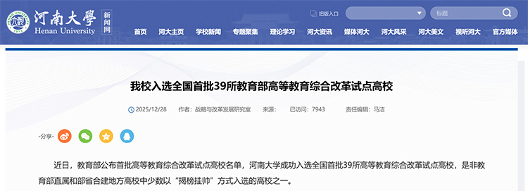 河南大學成功入選全國首批39所高等教育綜合改革試點高校,是非教育部直屬和部省合建地方高校中少數以“揭榜掛帥”方式入選的高校之一。