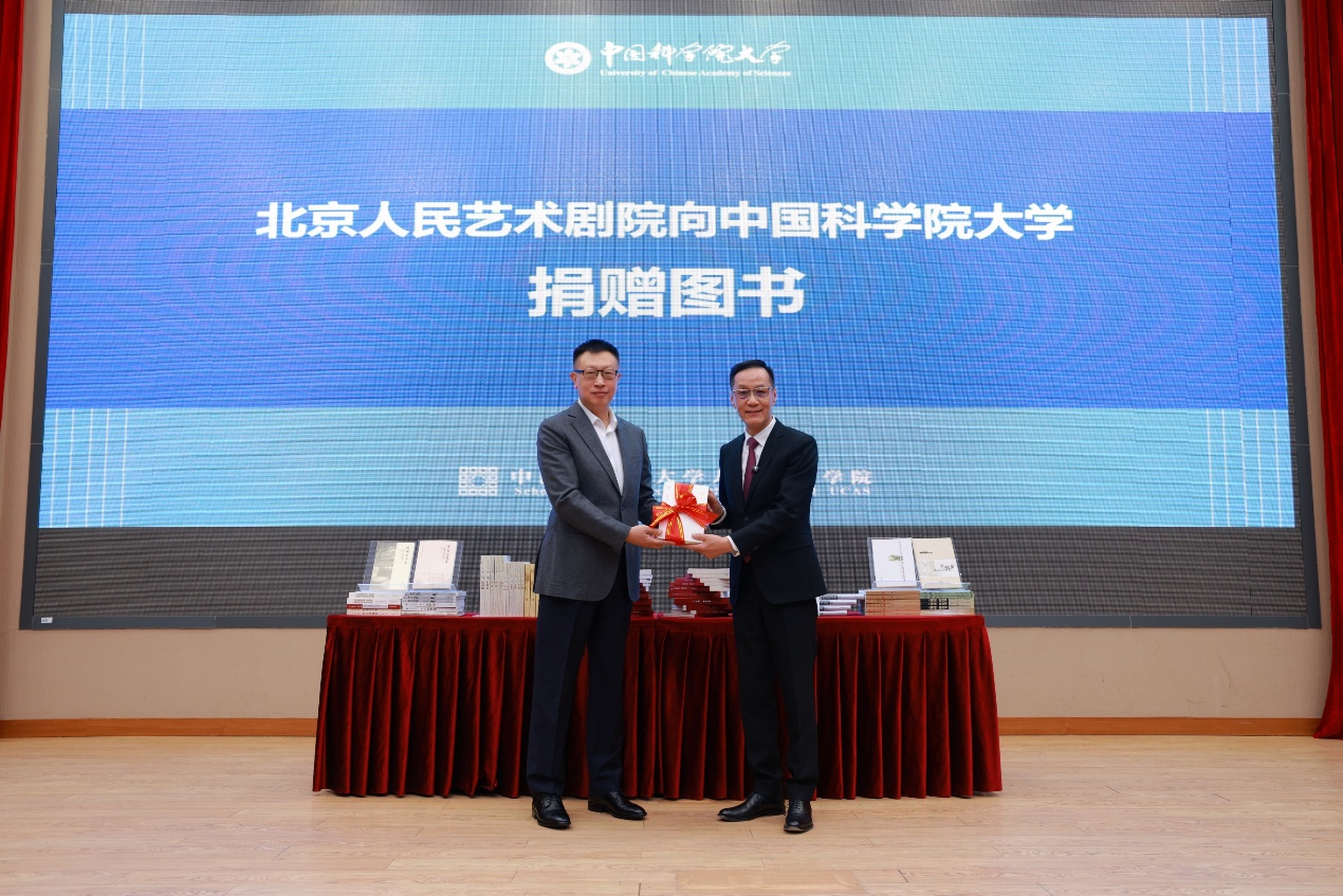 現(xiàn)場,馮遠(yuǎn)征代表北京人民藝術(shù)劇院向國科大捐贈圖書,書籍涵蓋經(jīng)典劇本集及舞臺藝術(shù)、畫冊、藝術(shù)理論專著等多個品類。周琪代表國科大向北京人民藝術(shù)劇院頒發(fā)捐贈證書。