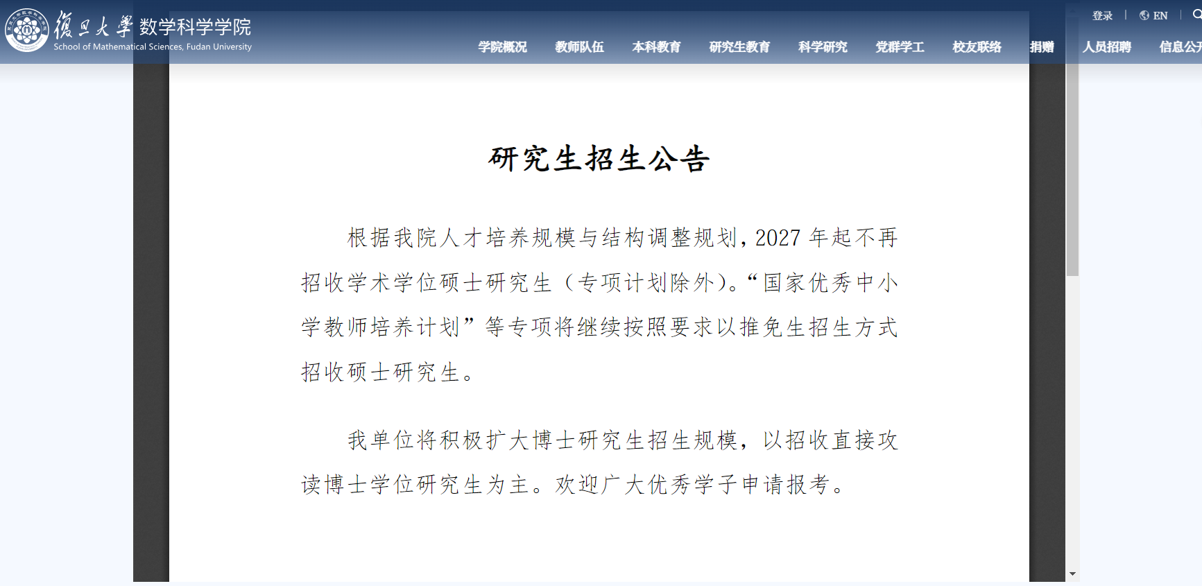 復(fù)旦大學(xué)數(shù)學(xué)科學(xué)學(xué)院:2027年起不再招收學(xué)術(shù)學(xué)位碩士研究生