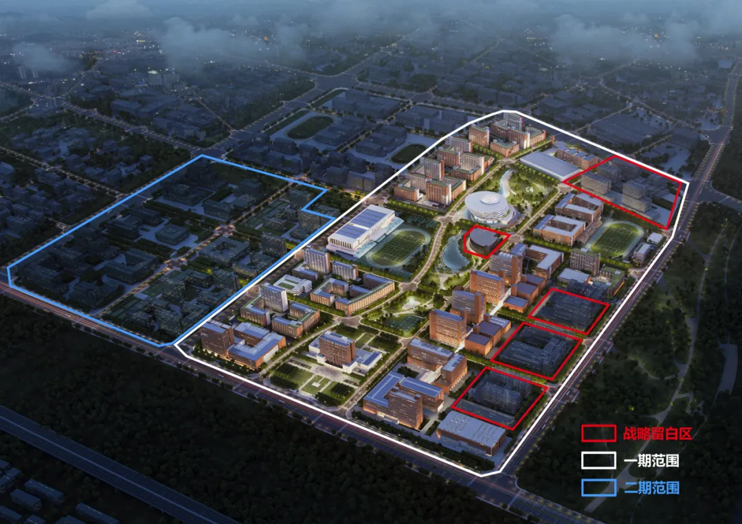 按照“整體規(guī)劃、分期建設(shè)”的思路,一期規(guī)劃用地面積700余畝,重點建設(shè)科研樓、教學(xué)樓、圖書館、體育館、學(xué)生宿舍、食堂/能源中心、操場等;二期規(guī)劃用地面積400余畝,重點布局產(chǎn)教融合、臨床研究相關(guān)平臺及機構(gòu)。