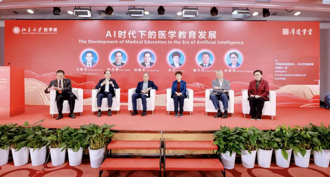 朱松純、林建華、Joseph Kolars、韓啟德、王維民以及密歇根大學教授Cheryl Moyer依次作專題報告,深度剖析智能文明新形態(tài)下未來大學與醫(yī)學教育挑戰(zhàn)與機遇。上午場的“AI時代下的醫(yī)學教育發(fā)展”圓桌研討中,韓啟德、林建華、喬杰、董爾丹、張艷萍展開深度對話。