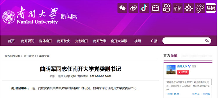 1月8日,南開(kāi)大學(xué)新聞網(wǎng)消息:日前,學(xué)校黨委接中共中央組織部通知:經(jīng)研究,曲明軍同志任南開(kāi)大學(xué)黨委副書(shū)記。