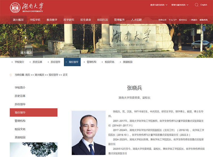 近日,湖南大學(xué)官網(wǎng)“現(xiàn)任領(lǐng)導(dǎo)”一欄更新顯示,張曉兵教授已任湖南大學(xué)黨委常委、副校長。據(jù)悉,張曉兵曾于2023年、2025年連續(xù)入選中國科學(xué)院化學(xué)部院士增選有效候選人名單。