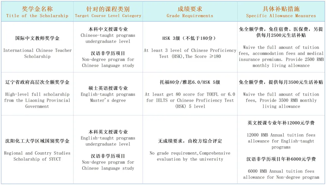 High-level Full Scholarship from the Liaoning Provincial Government is Primarily open to master's degree applicants (such as Chemical Engineering and Technology majors) . As long as the language requirements (TOEFL 80 or IELTS 6.0 or HSK Level 5) are met,you get a full tuition fees waiver and a monthly living allowance of 3500 RMB (covering your entire program).