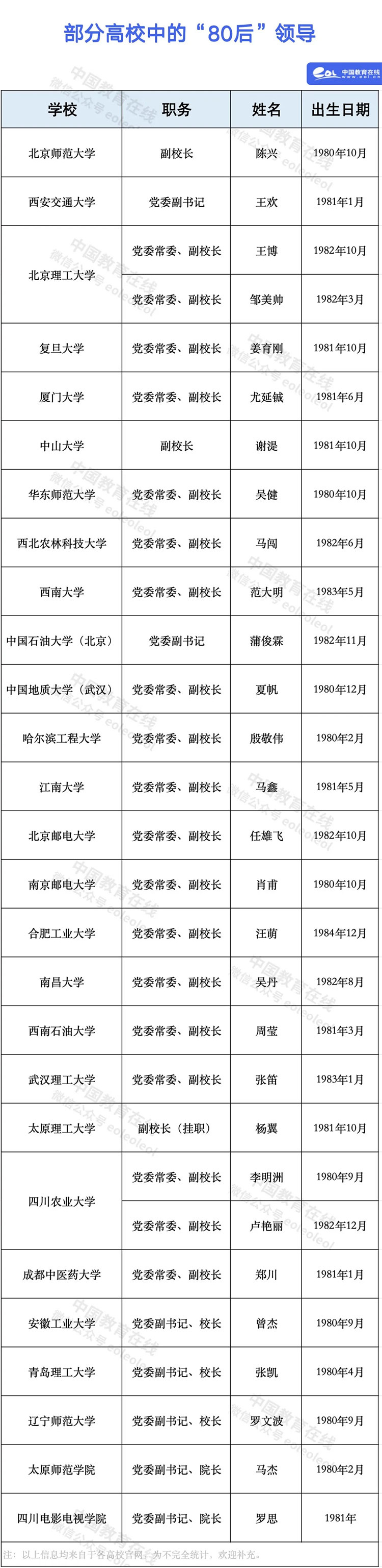 4、目前公開報道的80后高校領(lǐng)導(dǎo),副職居多,雙一流高校及頂尖高校,尚無80后正職校長。