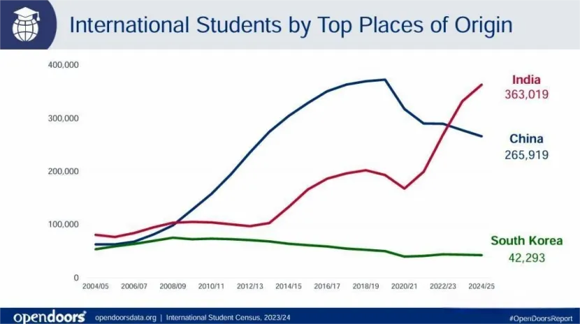 從全球看,留學(xué)規(guī)模仍在擴(kuò)大?!?025年美國(guó)門戶開(kāi)放報(bào)告》顯示,赴美留學(xué)生總數(shù)增長(zhǎng)4.5%,達(dá)到117萬(wàn)人的歷史高位。但與此同時(shí),中國(guó)赴美留學(xué)生人數(shù)卻下降至26.59 萬(wàn)人,連續(xù)5年下滑,與印度等國(guó)的差距進(jìn)一步拉大。
