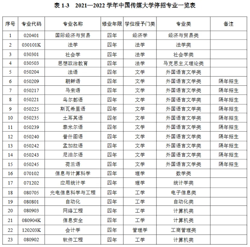 中國傳媒大學(xué)2021-2022學(xué)年停招專業(yè)一覽表