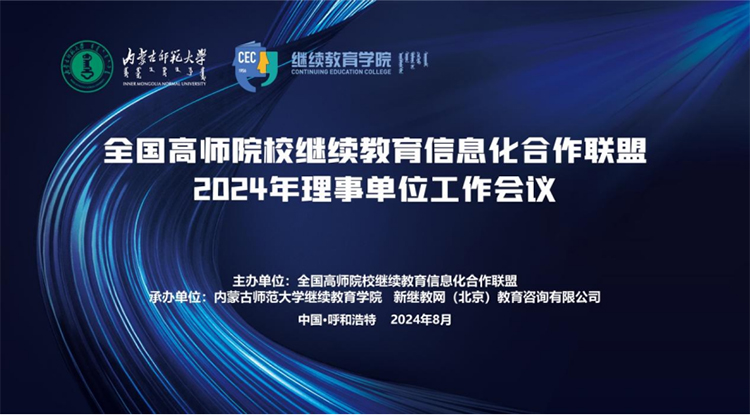 8月21日-8月23日,由全國高師院校繼續(xù)教育信息化合作聯(lián)盟主辦、內(nèi)蒙古師范大學(xué)繼續(xù)教育學(xué)院與新繼教網(wǎng)(北京)教育咨詢有限公司承辦的全國高師院校繼續(xù)教育信息化合作聯(lián)盟2024年理事單位工作會議在內(nèi)蒙古師范大學(xué)召開。教育部職業(yè)教育與成人教育司高等繼續(xù)教育處副處長徐璐、北京師范大學(xué)教授、全國高?,F(xiàn)代遠(yuǎn)程教育協(xié)作組常務(wù)秘書長李德芳、內(nèi)蒙古師范大學(xué)副校長賈美林以及來自哈爾濱師范大學(xué)、廣西師范大學(xué)、河南師范大學(xué)、四川師范大學(xué)、云南師范大學(xué)、安徽師范大學(xué)、河北師范大學(xué)、江西師范大學(xué)、東北師范大學(xué)等高校和聯(lián)盟秘書處新繼教網(wǎng)共80多位代表參加會議,會議由內(nèi)蒙古師范大學(xué)繼續(xù)教育學(xué)院黨總支書記袁常軍主持。