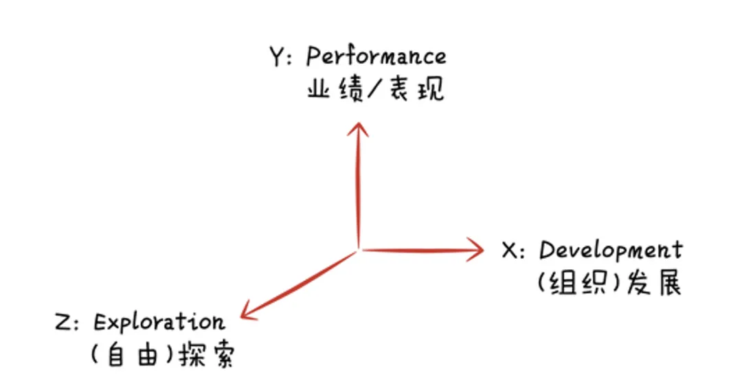 “三天”是這個(gè)模型的名字:X軸和Z軸代表著明天和后天,低估和忽視組織發(fā)展和探索未知,會(huì)讓企業(yè)看不到明天和后天;Y軸是今天,如果不能讓Y軸立得住,可能會(huì)導(dǎo)致組織輸在今天。同樣都是非常痛的領(lǐng)悟。Y軸是表現(xiàn)區(qū)的衡量,X軸和Z軸,都是學(xué)習(xí)區(qū)。從“三天”模型的角度,所謂的學(xué)習(xí)型組織,就是優(yōu)先考慮人的發(fā)展的組織,就是優(yōu)先重視明天和后天的組織。