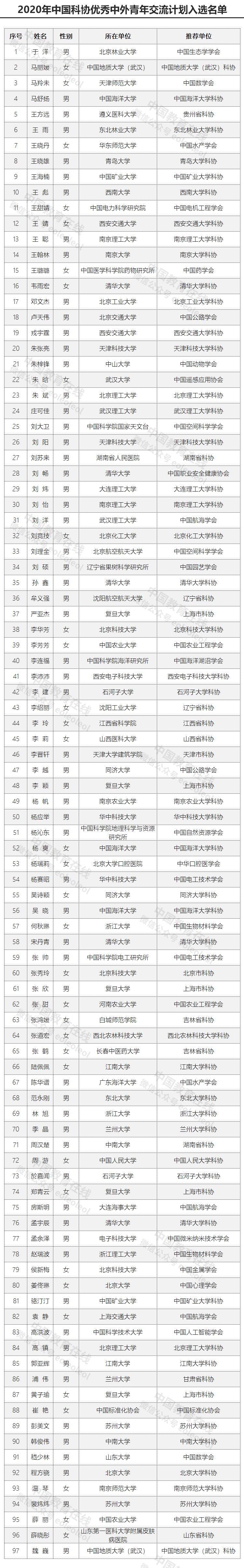 近日,中國科學技術協(xié)會公布2020年中國科協(xié)優(yōu)秀中外青年交流計劃入選名單。經推薦申報、形式審查、專家評審等環(huán)節(jié),2020年“青年交流計劃”共確定資助97名入選者。