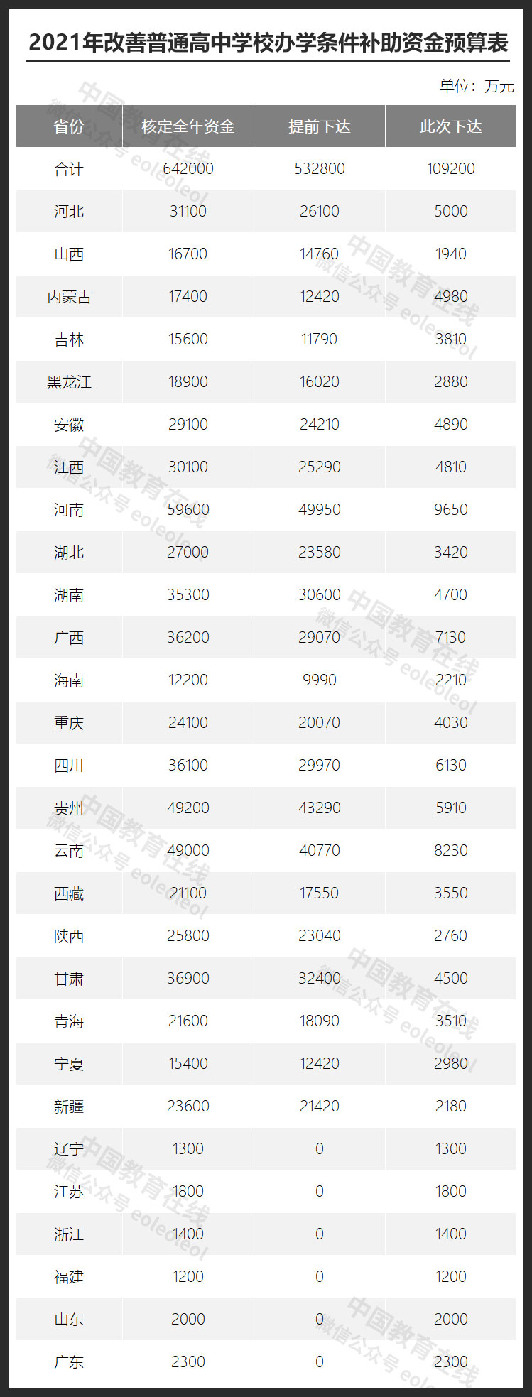 近日,財政部、教育部聯(lián)合印發(fā)《關于下達2021年改善普通高中學校辦學條件補助資金預算的通知》(以下簡稱《通知》),本次向各省(自治區(qū)、直轄市)下達改善普通高中學校辦學條件補助資金預算合計10.92億元,此前已提前下達53.28億元,共計64.2億元。
