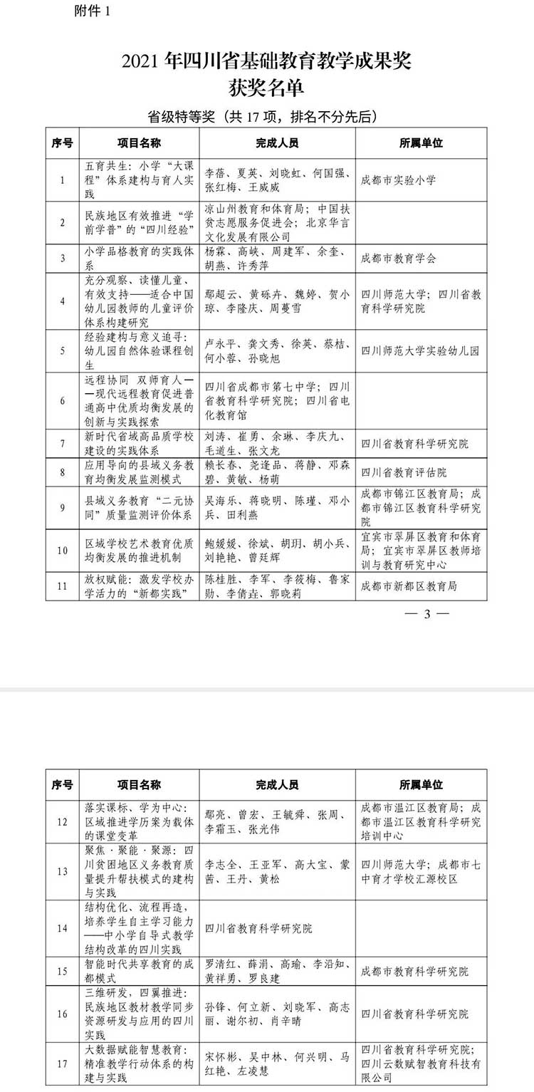 全部獲獎(jiǎng)名單:2021年四川省基礎(chǔ)教育教學(xué)成果獎(jiǎng)獲獎(jiǎng)名單