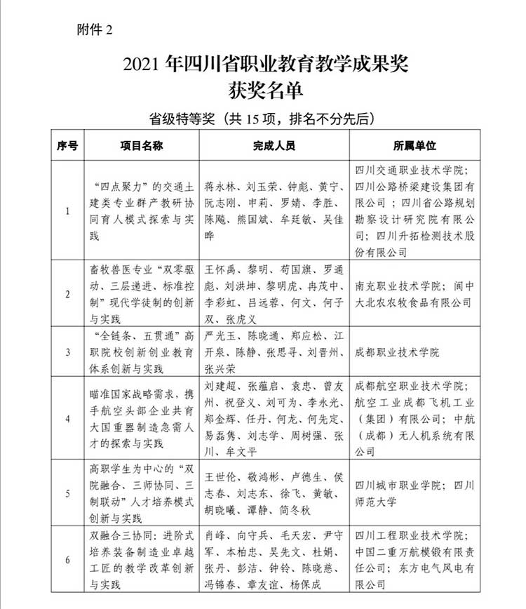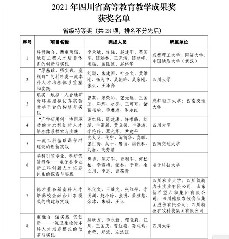 4月11日,四川省政府網(wǎng)站發(fā)布《四川省人民政府關(guān)于公布2021年四川省教學(xué)成果獎(jiǎng)的通知》。據(jù)悉,為激勵(lì)取得教學(xué)成果的集體及個(gè)人,鼓勵(lì)教育工作者從事教育教學(xué)研究,不斷提高教學(xué)水平和教育質(zhì)量,根據(jù)《教學(xué)成果獎(jiǎng)勵(lì)條例》(中華人民共和國(guó)國(guó)務(wù)院令第151號(hào))和《四川省教學(xué)成果獎(jiǎng)勵(lì)辦法》(四川省人民政府令第92號(hào))規(guī)定,經(jīng)專家評(píng)審、社會(huì)公示等規(guī)定程序,在基礎(chǔ)教育、職業(yè)教育、高等教育3個(gè)領(lǐng)域共評(píng)選出特等獎(jiǎng)60項(xiàng)、一等獎(jiǎng)260項(xiàng)、二等獎(jiǎng)680項(xiàng)。