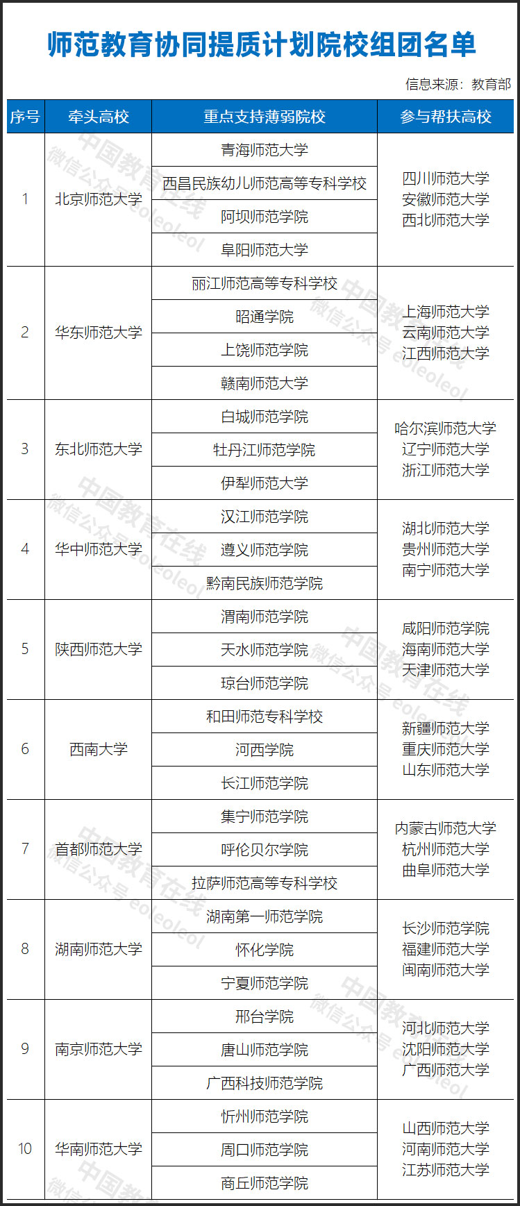 經各省教育廳推薦,教育部通過前期調研、形式審查、專家評議等環(huán)節(jié),最終確定由北京師范大學、華東師范大學、東北師范大學、華中師范大學、陜西師范大學、西南大學、首都師范大學、湖南師范大學、南京師范大學、華南師范大學等10所“雙一流”師范大學牽頭,四川師范大學、安徽師范大學、西北師范大學等30所高水平師范院校參與,支持幫扶青海師范大學、西昌民族幼兒師范高等??茖W校、阿壩師范學院等32所地方薄弱師范院校。
