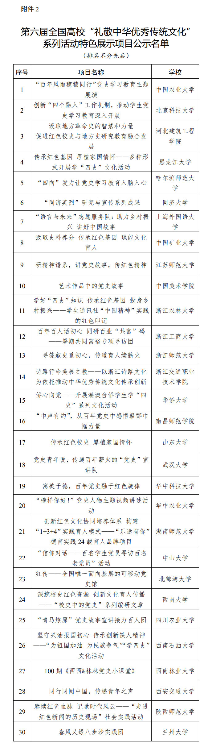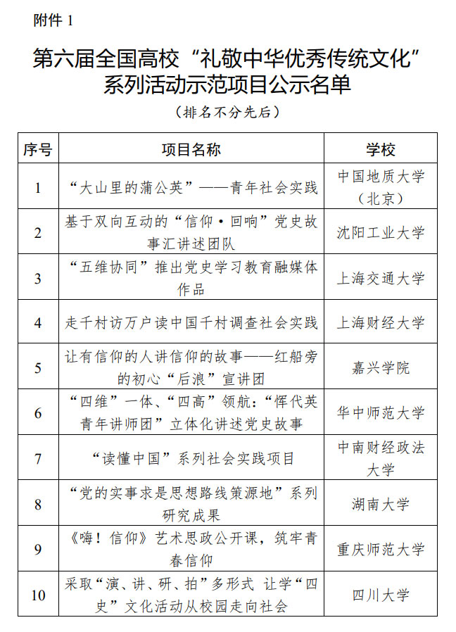 根據(jù)《教育部辦公廳關(guān)于開展第六屆全國高?!岸Y敬中華優(yōu)秀傳統(tǒng)文化”系列活動的通知》(教思政廳函〔2021〕5號)要求,經(jīng)高校自主申報、專家審核推薦等環(huán)節(jié),產(chǎn)生示范項目10項、特色展示項目30項。公示期為2022年9月26日至10月2日。