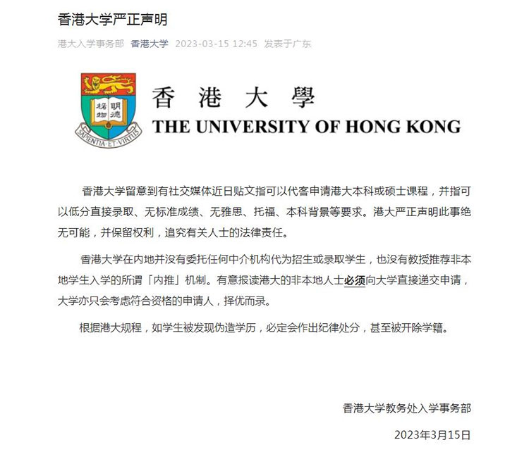 中新網3月15日電 據香港大學微信公眾號消息,15日,香港大學教務處入學事務部發(fā)布聲明指,香港大學留意到有社交媒體近日貼文指可以代客申請港大本科或碩士課程,并指可以低分直接錄取、無標準成績、無雅思、托福、本科背景等要求。港大嚴正聲明此事絕無可能,并保留權利,追究有關人士的法律責任。