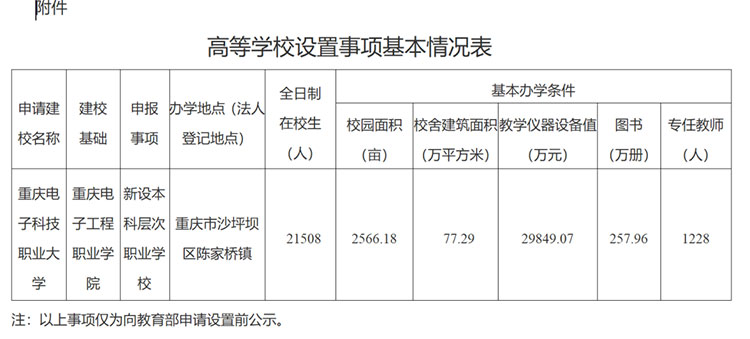 10月8日,重慶市教育委員會(huì)對(duì)高等學(xué)校設(shè)置事項(xiàng)進(jìn)行公示:根據(jù)《中華人民共和國(guó)高等教育法》《普通高等學(xué)校設(shè)置暫行條例》《本科層次職業(yè)學(xué)校設(shè)置標(biāo)準(zhǔn)(試行)》等有關(guān)規(guī)定要求,經(jīng)市高校設(shè)置評(píng)議委員會(huì)專家考察和評(píng)議,擬向教育部申報(bào)設(shè)置重慶電子科技職業(yè)大學(xué)。