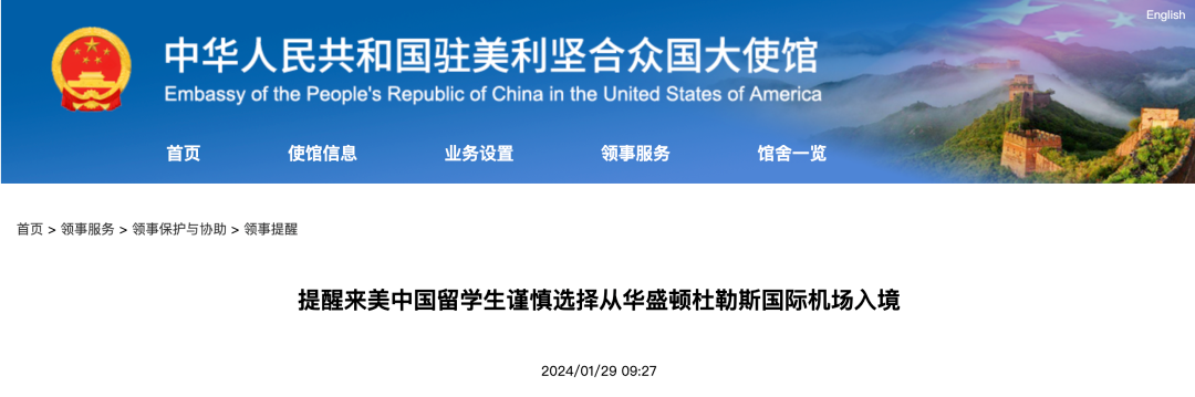 我使館提醒赴美中國(guó)留學(xué)生謹(jǐn)慎選擇從華盛頓杜勒斯國(guó)際機(jī)場(chǎng)入境