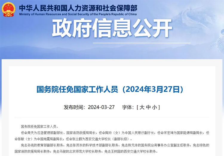 任命周天為應(yīng)急管理部副部長(zhǎng)、國(guó)家消防救援局局長(zhǎng);任命陶玲(女)為中國(guó)人民銀行副行長(zhǎng);任命宋宏坤為國(guó)家能源局副局長(zhǎng);任命張敏(女)為中國(guó)地震局副局長(zhǎng);任命張立群為西安交通大學(xué)校長(zhǎng)(副部長(zhǎng)級(jí))。
