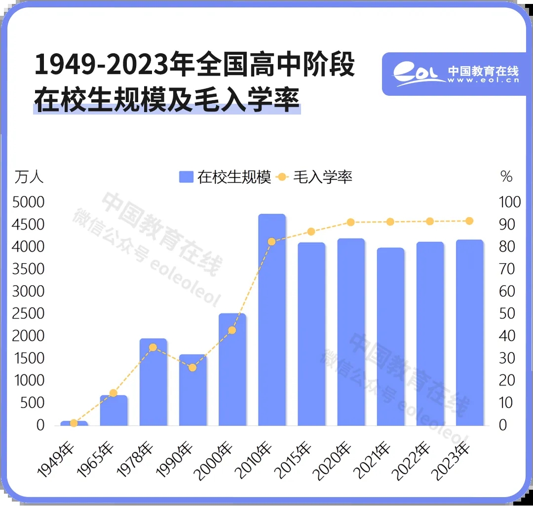 1949年高中階段在校生數(shù)44萬人,2023年達到4542萬人,增長103倍;其中,普通高中在校生數(shù)由1949年的21萬人增加到2023年的2804萬人,增長134倍。