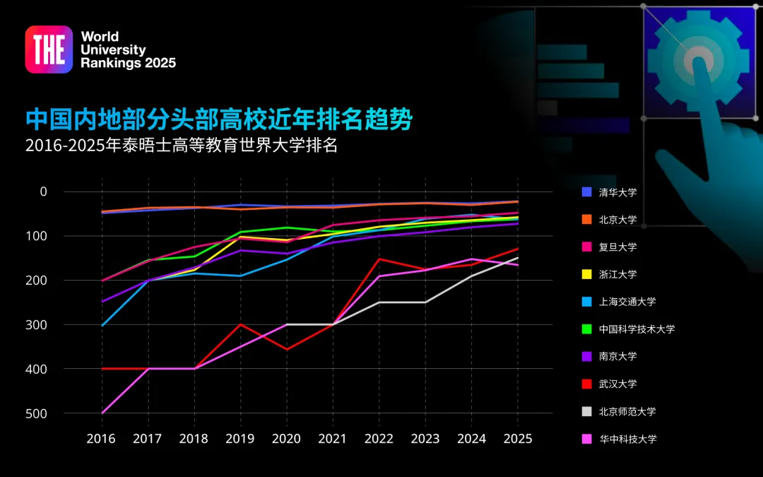 2016-2025年THE世界大學排名中中國內(nèi)地部分頭部高校排名趨勢