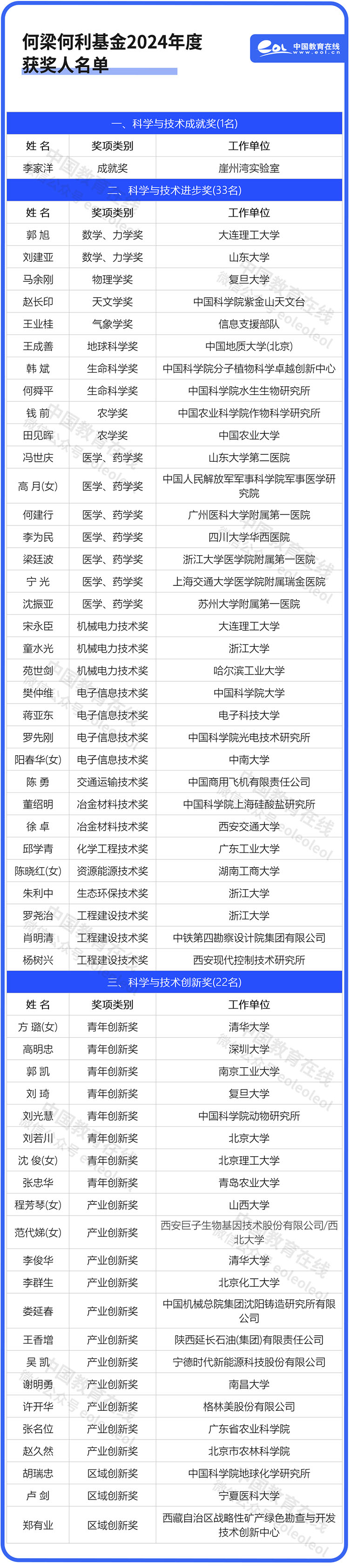 據(jù)介紹,何梁何利基金是香港愛國金融實(shí)業(yè)家何善衡、梁銶琚、何添、利國偉先生于1994年3月30日捐資創(chuàng)立的、以獎(jiǎng)勵(lì)中華人民共和國杰出科技工作者為宗旨的科技獎(jiǎng)勵(lì)基金。2024年度有1名為我國科技進(jìn)步與創(chuàng)新作出卓越貢獻(xiàn)的杰出科技工作者,榮獲“何梁何利基金科學(xué)與技術(shù)成就獎(jiǎng)”,授予證書、獎(jiǎng)金100萬港元;33名在科學(xué)技術(shù)領(lǐng)域取得重大發(fā)明、發(fā)現(xiàn)和科技成果的優(yōu)秀科技工作者,榮獲“何梁何利基金科學(xué)與技術(shù)進(jìn)步獎(jiǎng)”,各授予證書、獎(jiǎng)金20萬港元;22名具有高水平科技成就,通過技術(shù)創(chuàng)新和管理創(chuàng)新,創(chuàng)造重大經(jīng)濟(jì)效益和社會(huì)效益的優(yōu)秀科技工作者,榮獲“何梁何利基金科學(xué)與技術(shù)創(chuàng)新獎(jiǎng)”,各授予證書、獎(jiǎng)金20萬港元。
