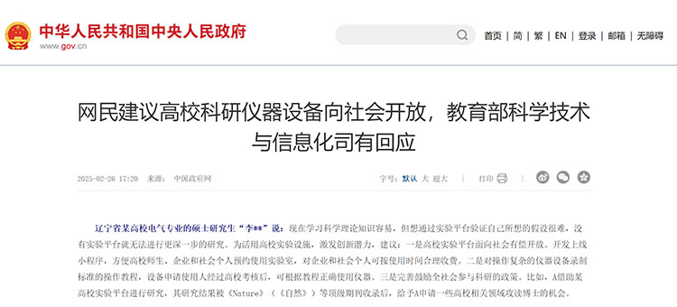 近日,有網(wǎng)友在中國政府網(wǎng)上留言,建議高校實驗平臺和科研儀器設(shè)備向社會開放。2月26日,教育部科學(xué)技術(shù)與信息化司回復(fù)稱,教育部歷來高度重視推動高校重大科研基礎(chǔ)設(shè)施和大型科研儀器設(shè)備全面開放、充分共享。目前,31個?。ㄗ灾螀^(qū)、直轄市)342家中央級高校和科研院所建立了在線服務(wù)平臺并按照統(tǒng)一的標(biāo)準(zhǔn)規(guī)范與重大科研基礎(chǔ)設(shè)施和大型科研儀器國家網(wǎng)絡(luò)管理平臺互聯(lián)對接,14.1萬臺(套)原值50萬元及以上的大型科研儀器已納入平臺開放共享。