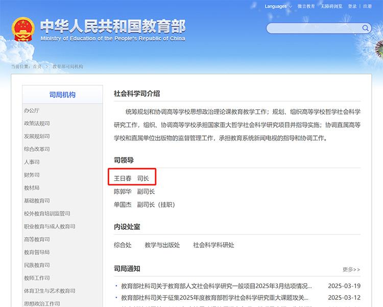 日前,教育部官網(wǎng)顯示,王日春出任教育部社會科學司司長,原社科司司長徐青森現(xiàn)任教育部黨組成員、副部長。