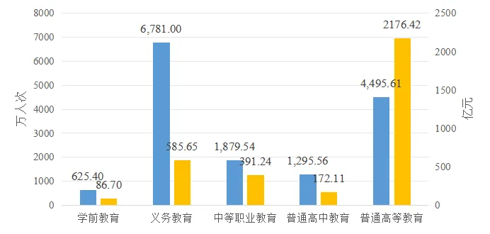 其中,資助學(xué)前教育幼兒625.40萬(wàn)人次,資助金額86.70億元;資助義務(wù)教育學(xué)生6781.00萬(wàn)人次,資助金額585.65億元;資助中等職業(yè)教育學(xué)生1879.54萬(wàn)人次,資助金額391.24億元;資助普通高中教育學(xué)生1295.56萬(wàn)人次,資助金額172.11億元;資助普通高等教育學(xué)生4495.61萬(wàn)人次,資助金額2176.42億元。