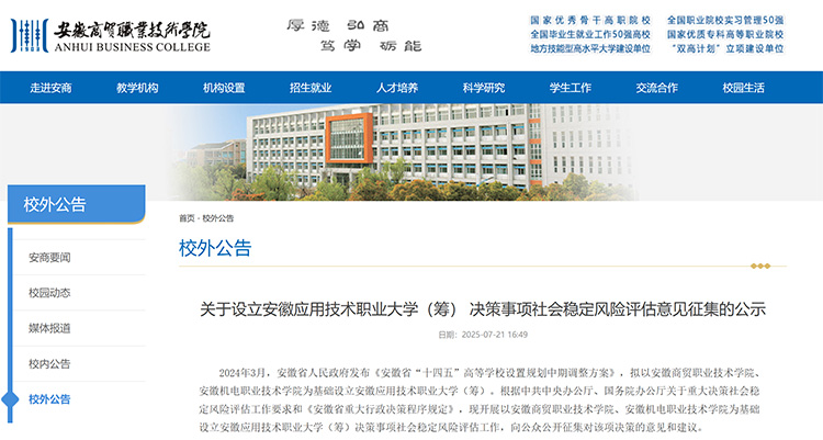 7月21日,安徽商貿(mào)職業(yè)技術(shù)學(xué)院官網(wǎng)發(fā)布“關(guān)于設(shè)立安徽應(yīng)用技術(shù)職業(yè)大學(xué)(籌) 決策事項(xiàng)社會穩(wěn)定風(fēng)險評估意見征集的公示”。