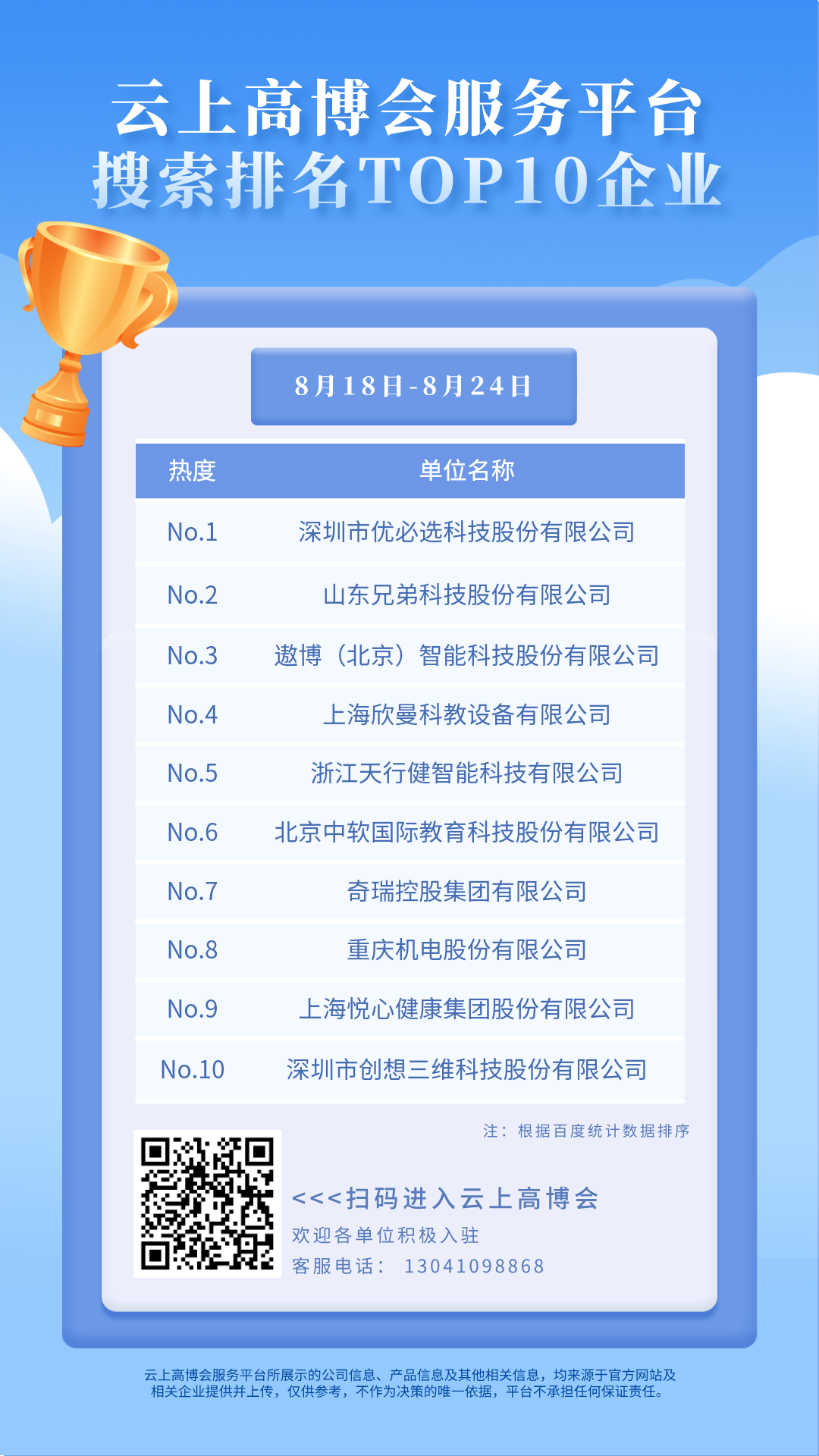云上高博會服務平臺8月25日-8月31日搜索熱門榜單出爐。該榜單依托百度統(tǒng)計數(shù)據(jù),綜合網(wǎng)站搜索熱度與訪問量,分別篩選出企業(yè)、高校 TOP10名單。