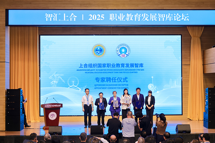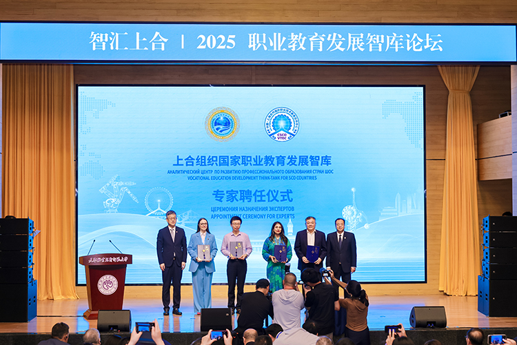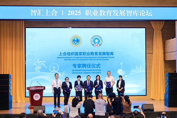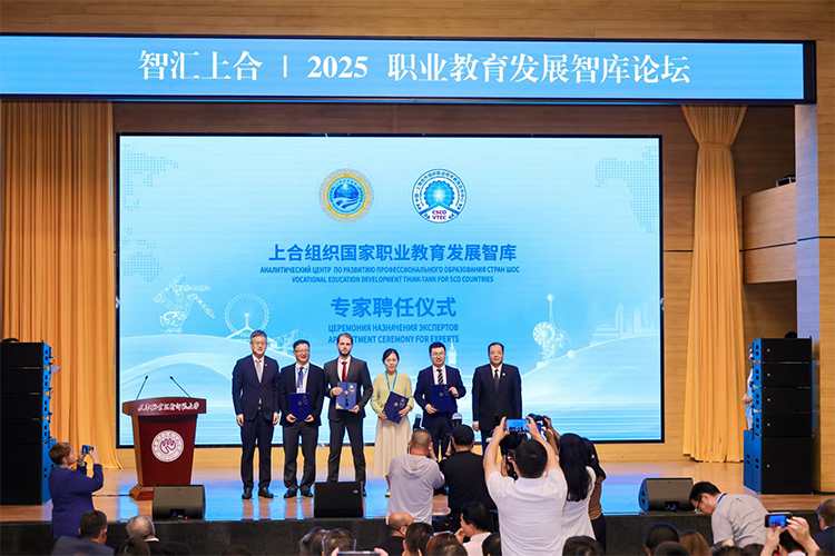 上合組織國家職業(yè)教育發(fā)展智庫專家聘任環(huán)節(jié),中國教育部課程教材研究所副所長曾天山,天津教育委員會副主任羅延安,天津職業(yè)技術師范大學校務委員會主席張金剛,天津職業(yè)技術師范大學校長鄭清春,中國教育部魯班工坊建設專家委員會主任呂景泉,天津職業(yè)技術師范大學黨委副書記李靖為智庫專家頒發(fā)聘書。