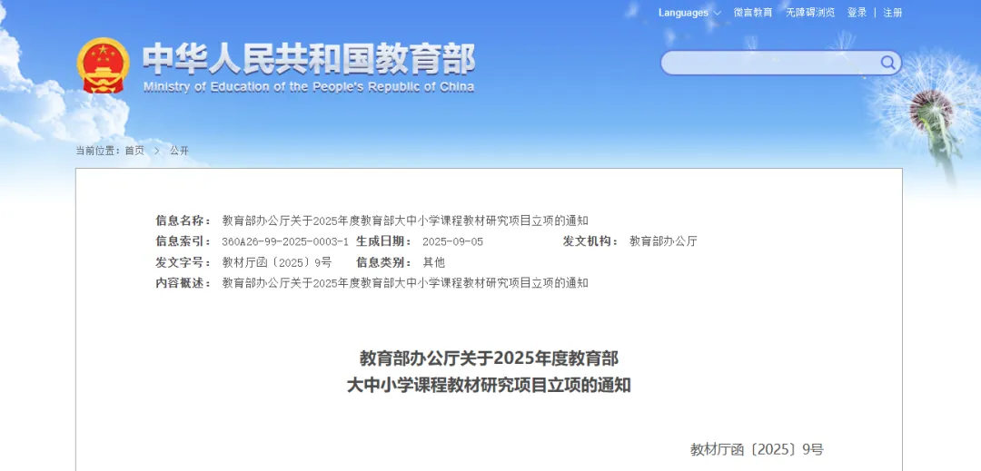 9月30日,教育部辦公廳發(fā)布關(guān)于2025年度教育部大中小學(xué)課程教材研究項目立項的通知。