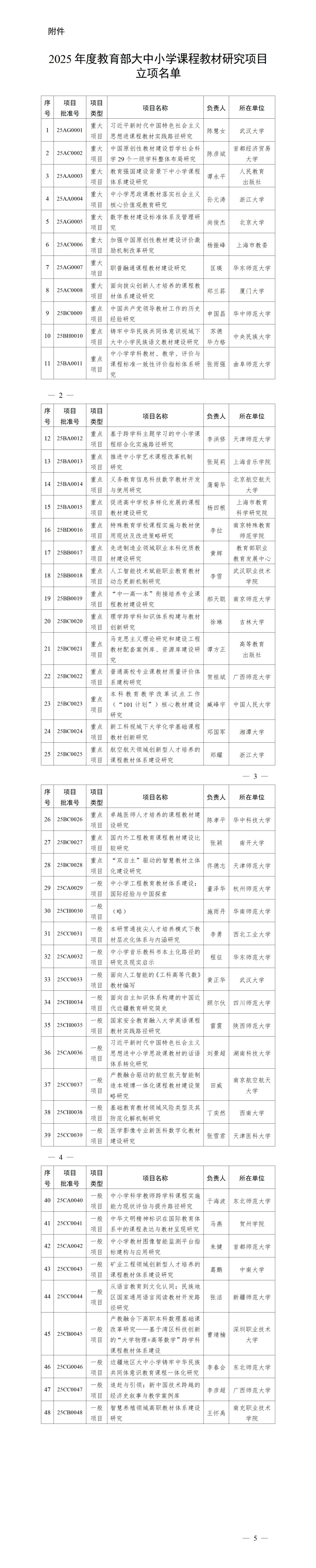 根據(jù)《教育部大中小學(xué)課程教材研究項目管理辦法》(教材廳〔2025〕1號)和《教育部辦公廳關(guān)于組織申報2025年度教育部大中小學(xué)課程教材研究項目的通知》(教材廳函〔2025〕7號),經(jīng)組織申報、專家嚴格評審并面向社會公示,2025年度教育部大中小學(xué)課程教材研究項目共立項48項,現(xiàn)予以公布。各立項項目具體要求及安排由項目辦公室另行通知。