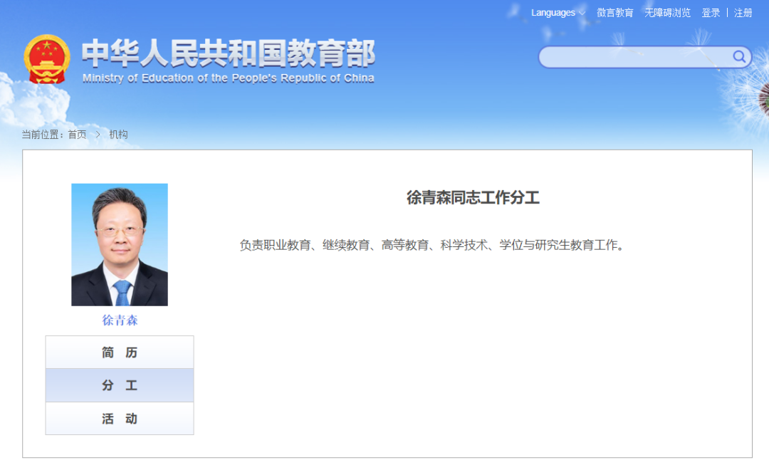 近日,教育部官網(wǎng)更新了教育部領導的分工,徐青森副部長分管職業(yè)教育、繼續(xù)教育、高等教育、科學技術、學位與研究生教育工作。